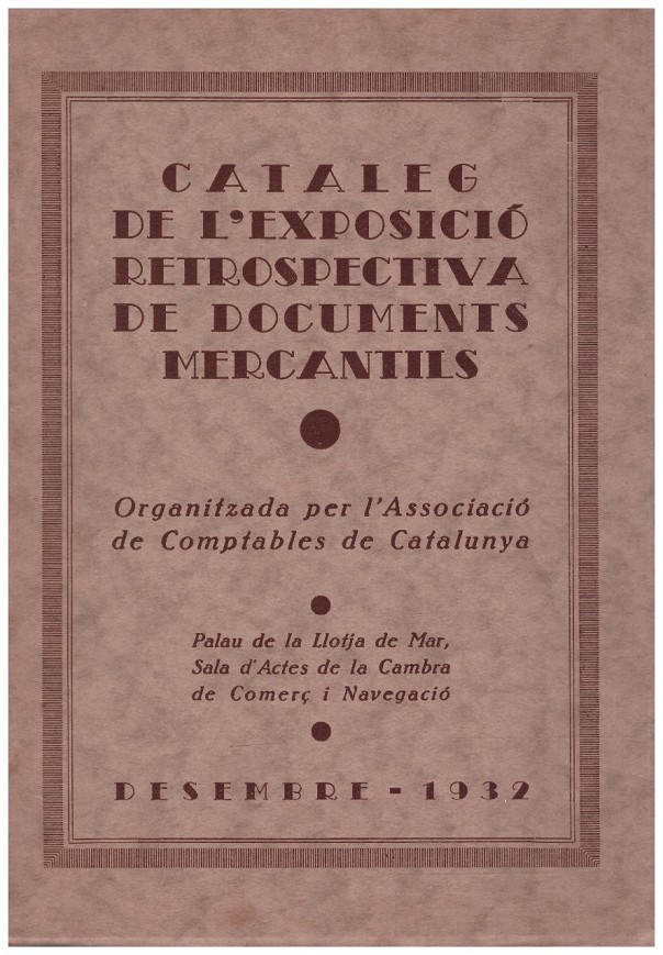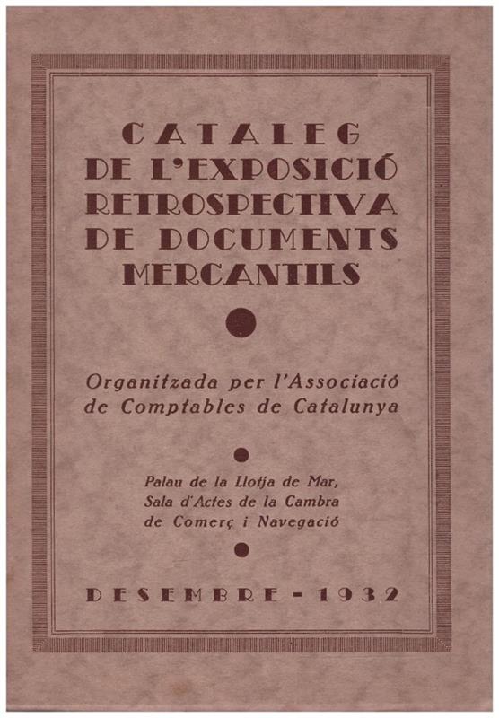 Catálogo oficial de la exposición retrospectiva celebrada en el Palau de la Llotja de Mar (Sala de Actos de la Cámara de Comercio y Navegación de Barcelona), diciembre de 1932. Publicación con fines divulgativos e históricos organizada por la Asociación de Contables de Cataluña. Recoge una muestra de documentos comerciales, libros de cuentas, registros contables y otros materiales de interés para la historia económica y la contabilidad.