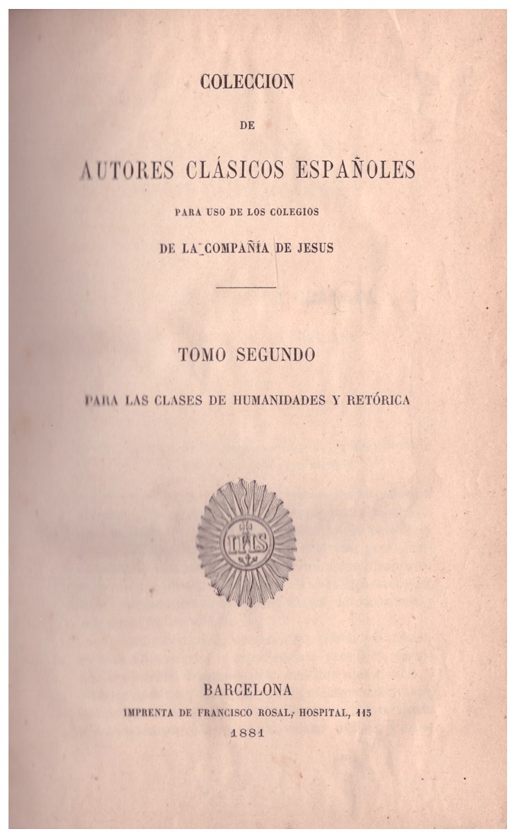 Colección de autores clásicos españoles para el uso de los colegios de la Compañia de Jesus. Tomo segundo, para las clases de humanidades y retórica. Cubiertas rozadas, envejecido.