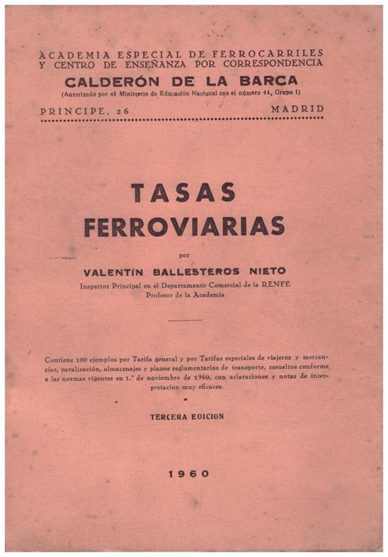 Academia especial de Ferrocarriles y Centro de Enseñanza por Correspondencia. Calderón de la Barca. Contiene 100 ejemplares por Tarifa general y por Tarifas especiales de viajeros y mercacías, paralización almacenajes y plazos reglamentarios de transporte, resueltos conforme a las normas vigentes en...