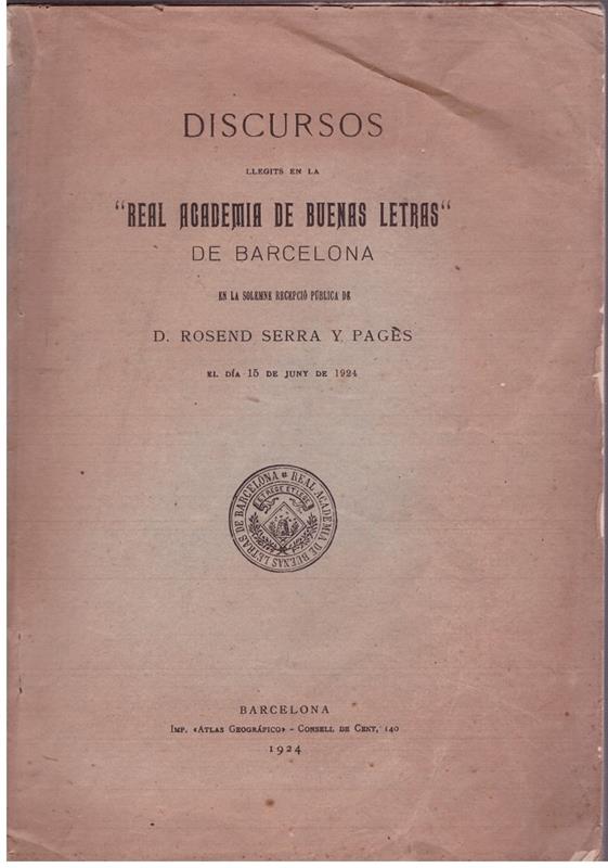 Discursos leidos en la Academia de Buenas Letras de Barcelona, en la solemne recepción pública de D. Rosend serra y pages, el día 15 de junio de 1924. Imprenta Atlas Geogràfico. 49 pp. Intonso. Papel amarillento. Ref. C16B4.