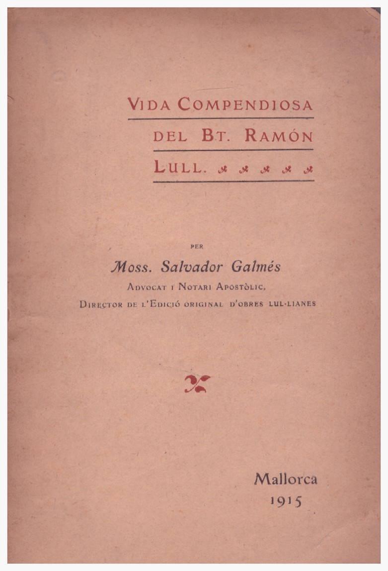 L'origen d'aquesta biografia és una conferència que Galmés donà al Foment del Civisme el dia 9 de maig del mateix any per encàrrec de la Comissió Diocesana de les Festes del VI centenari de la mort de Ramon Lull