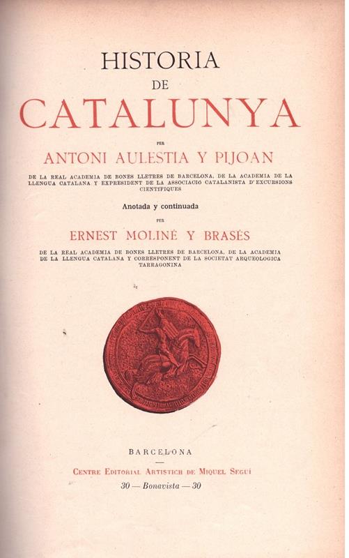 HISTORIA DE CATALUNYA. ANTONI AULESTIA. COMENTADA I CONTINUADA PER ERNEST I BRASES.BARCELONA: CENTRO EDITORIAL ARTISTIC DE MIQUEL SEGUI,