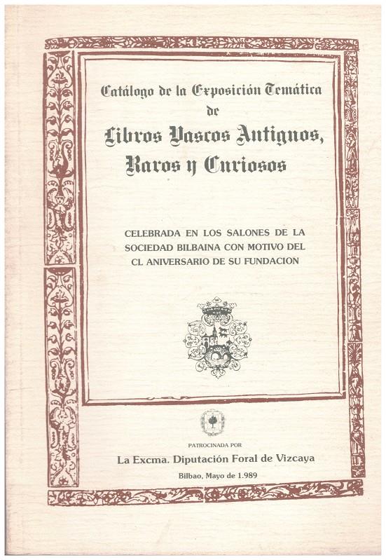 • CATÁLOGO DE LA EXPOSICIÓN TEMÁTICA DE LIBROS VASCOS ANTIGUOS, RAROS Y CURIOSOS. Celebrada en los Salones de la Sociedad Bilbaina con motivo del CL ani