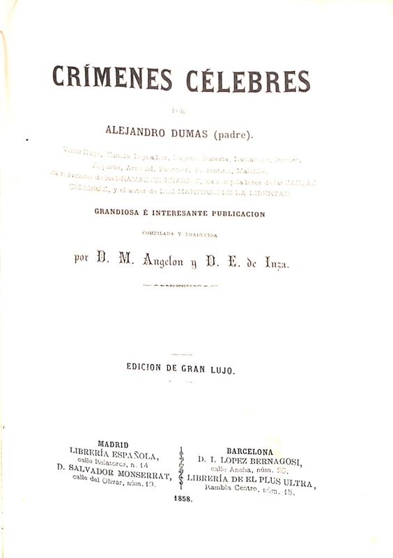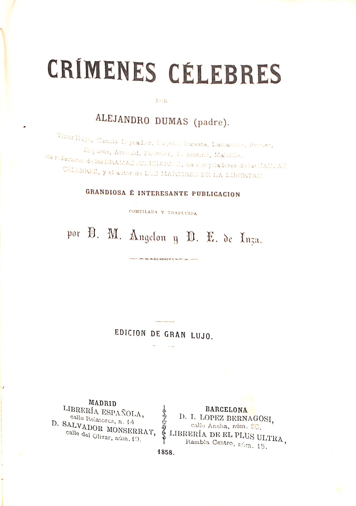 Compilada y Traducida por D. M Angelon y D. M. de Inza. Alejandro Dumas. (padre) y más 10 redactores de los Dramas Judiciarios, los compiladores de las causas célebres, y el autor de los Martires de la Libertad. Impr. Luis Tasso. Barcelona. 1858. 1116 pp. 34 láminas fuera de texto. Enc. en pasta española, guardas en papel de aguas, gofrado en el lomo. Manchas de oxido.