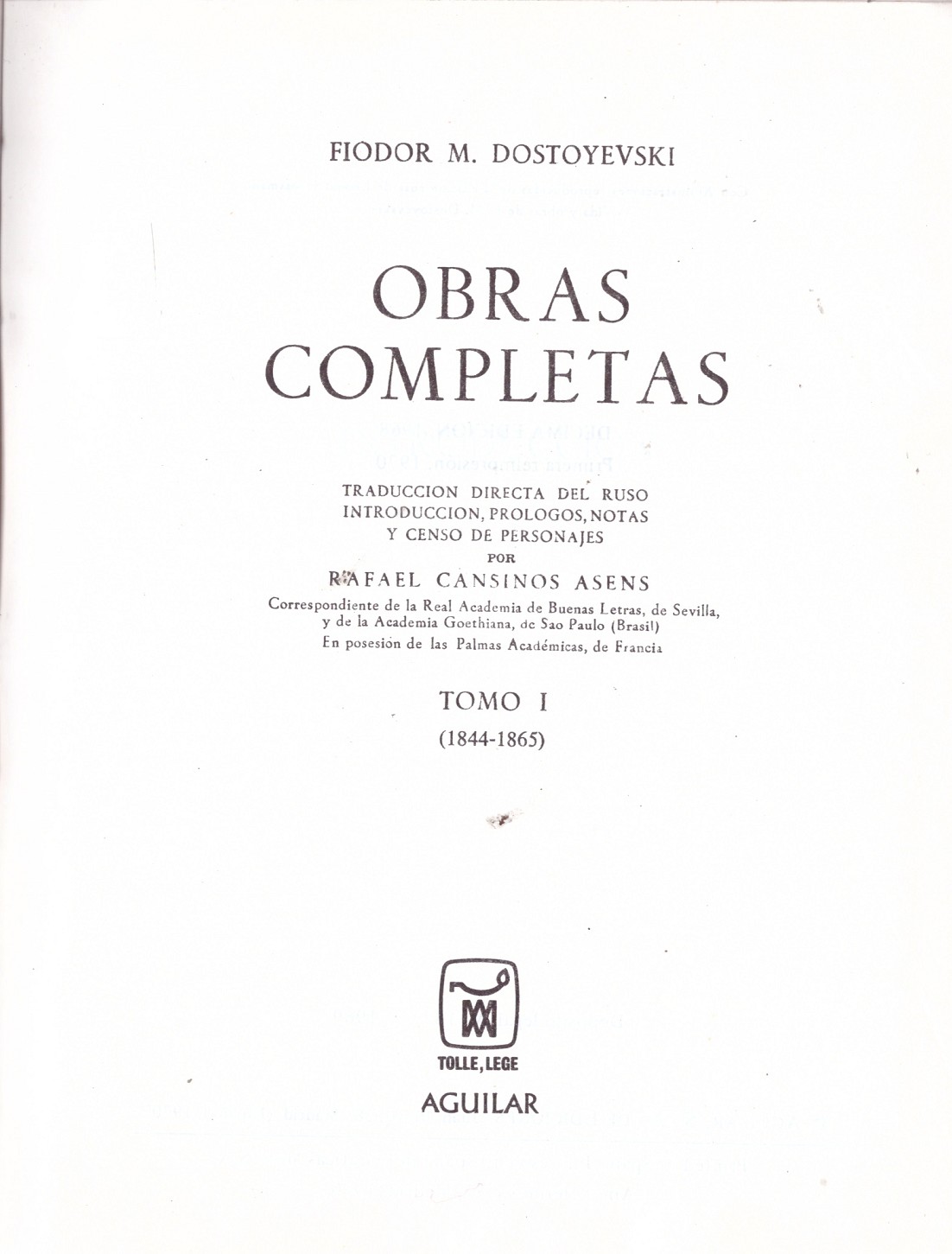 Traducción directa del ruso, introducción, prologos, notas y censo de personajes por Cansinos Asens, Rafael. Tomo I. Primera reimpresión 1970. Papel biblia. Dedicatoria en boli en la portada. En las guardas y en las primeras paginas daños de insectos bibliofago.