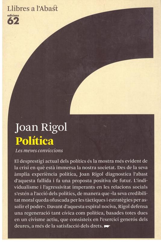 "El desprestigi actual dels polítics és la mostra més evident de la crisi en què està immersa la nostra societat". Des de la seva àmplia experiència política, Joan Rigol diagnostica l'abast d'aquesta fallida i fa una proposta positiva de futur. L'individualisme i l'agressivitat imperants en les relacions socials s'estén a l'acció dels polítics, de manera que «la seva credibilitat moral queda ofuscada per les tàctiques i estratègies per assolir el poder». Davant d'aquesta espiral nociva, Rigol defensa una regeneració tant cívica com política, basades totes dues en un civisme actiu, que consisteix en l'exercici generós dels deures, a més de la satisfacció dels drets. La regeneració dels polítics passa precisament pel seu compromís com a ciutadans: «L'eix de l'actitud militant és l'assumpció de responsabilitats de civisme actiu i saber-ho traduir en programa polític. Tot militant, a més de ser polític, ha de portar entre mans compromisos cívics i comunitaris en la pròpia societat».