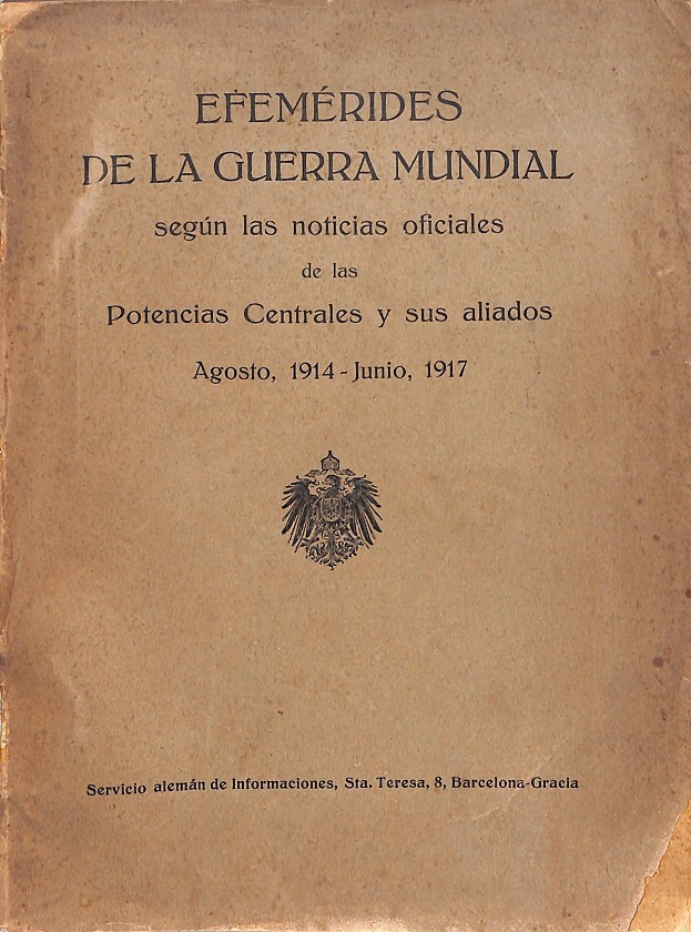 Editado por el Servicio alemán de Informaciones de Barcelona. Sin fecha. Contiene mapa desplegable de los diferentes teatros de la Guerra, obsequio del Servicio Alemán de Informaciones, Barcelona, a sus lectores. Encuadernación en rústica, con la cubierta fatigada. .
