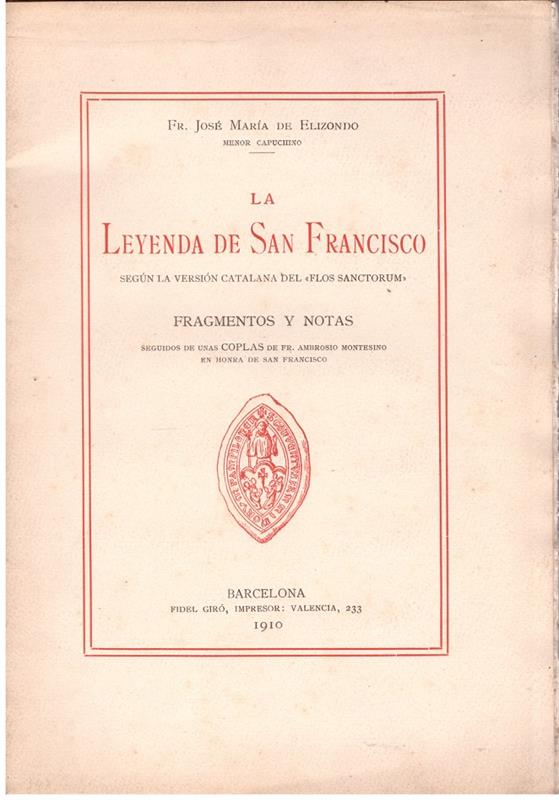 La leyenda de San francisco según la versión catalana de "Flos Sanctorum"(fragmentos y notas). Extracto del número extraordinario de la Revista de Estudios Franciscanos (abril-mayo de 1910). Una fotografía en b/n. Intonso. Papel de hilo, con barbas. Impresor Fidel Giró. 43 pp.