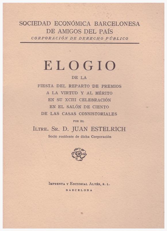 Presentado por la Corporación de Derecho Público de la Sociedad Económica Barcelonesa de Amigos del País. Barcelona. 1948. 12 pp. 17 cms. Enc. rústica. Juan Estelrich, socio de dicha Corporación, hace un elogio de la fiesta del reparto de premios a la virtud y al mérito en su XCIII celebración en el salón de Ciento de las casas consistoriales.