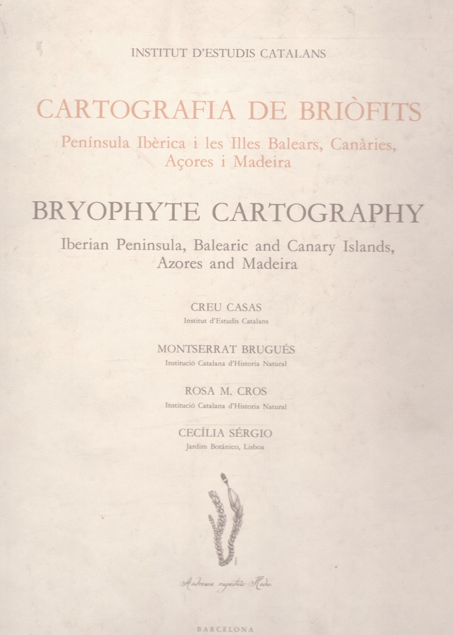 1ª ed. 1996. Barcelona. Textos de Cr. Casas, M. Brugués, R. Mª Cros y C. Sérgio. Fascículo cuarto: Enc. tipo carpeta: dividido en texto 141 pp. y 50 mapas a b/n. Lomo tela. Catalán - Inglés. Mapas de distribución de cincuenta especies de briófitos de la Península Ibérica y las Islas Baleares, Canarias, Azores y Madeira.
