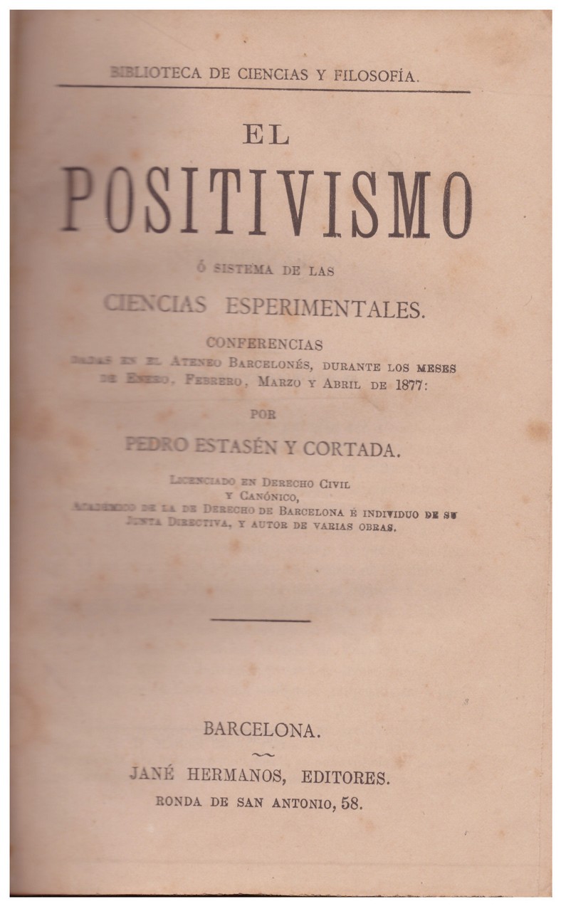 El positivismo o sistema de las ciencias esperimentales. Conferencias dadas en el Ateneo Barcelonés, durante los meses de Enero, Febrero, Marzo y Abril de 1877.
