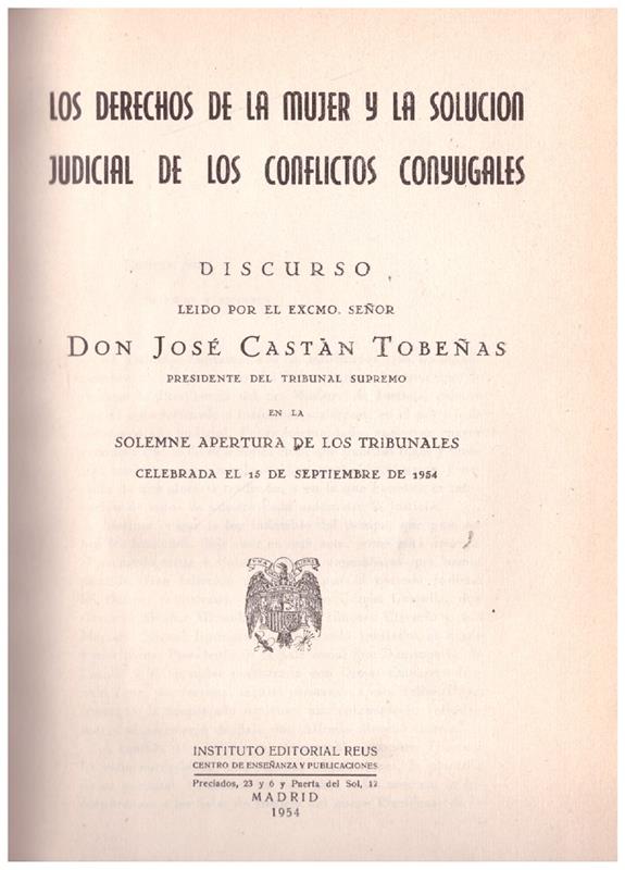 Discurso leído por Don José Castán Tobeñas, presidente del Tribunal Supremos en la solemne apertura de los tribunales celebrada el 15 de septiembre de 1954. 221 pp. Cubiertas algo rozadas.