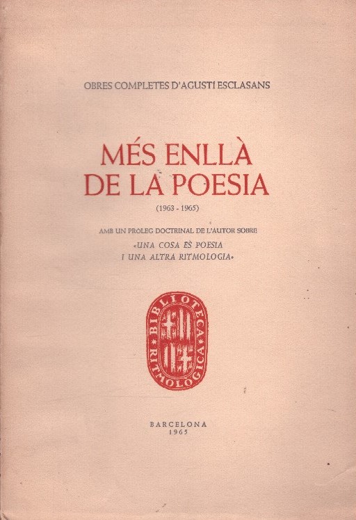 Obres completes de l'autor. Amb próleg doctrinal de l'autor sobre "Una cosa és poesía i una altra Ritmologia" Biblioteca ritmologica, dedicado por el autor. Enc. Rustica, papel de hilo, solo 100 ej., Catalan, 100 pp. Corte barbado. Con dibujo alegorico de la Ritmologia, por Josep Aragay. 103 pp.