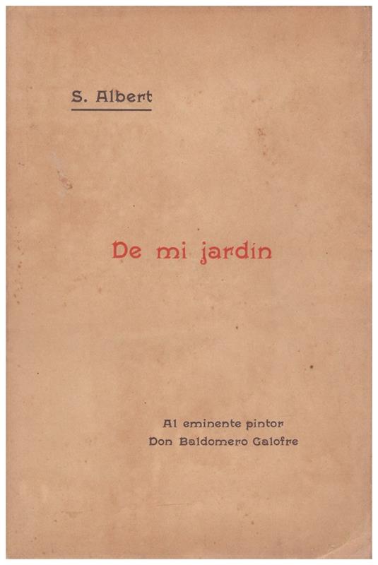 Prólogo de Emilio Tintorer. Impreso por Fidel Giró. Barcelona. 1903. 128 pp. 19 cms. Enc. rústica. Cubierta deslucida. Lomo rasgado. Intonso. Poemas relacionados con la jardinería y dedicados al eminente pintor Baldomero Galofre.