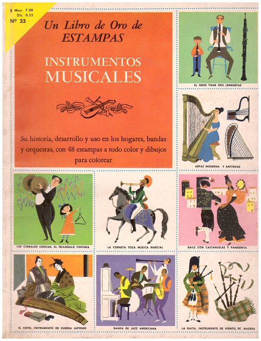 Un libro de oro de estampas, nº33: Instrumentos musicales. Su historia, desarrollo y uso en los hogares, bandas y orquestas, con 48 estampas a todo color y dibujos para colorear. Completo.