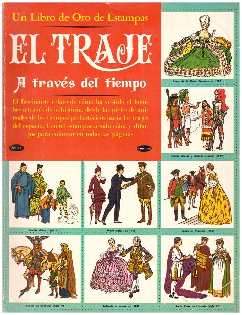 Un libro de oro de estampas, nº57: El traje a través del tiempo. El fascinante relato de cómo ha vestido el hombre a través de la historia, desde las pieles de animales de los tiempos prehistóricos hasta los trajes del espacio. Con 64 estampas a todo color y dibujos para colorear en todas las páginas. Faltan 4 cromos. Pequeño corte en la cubierta posterior.