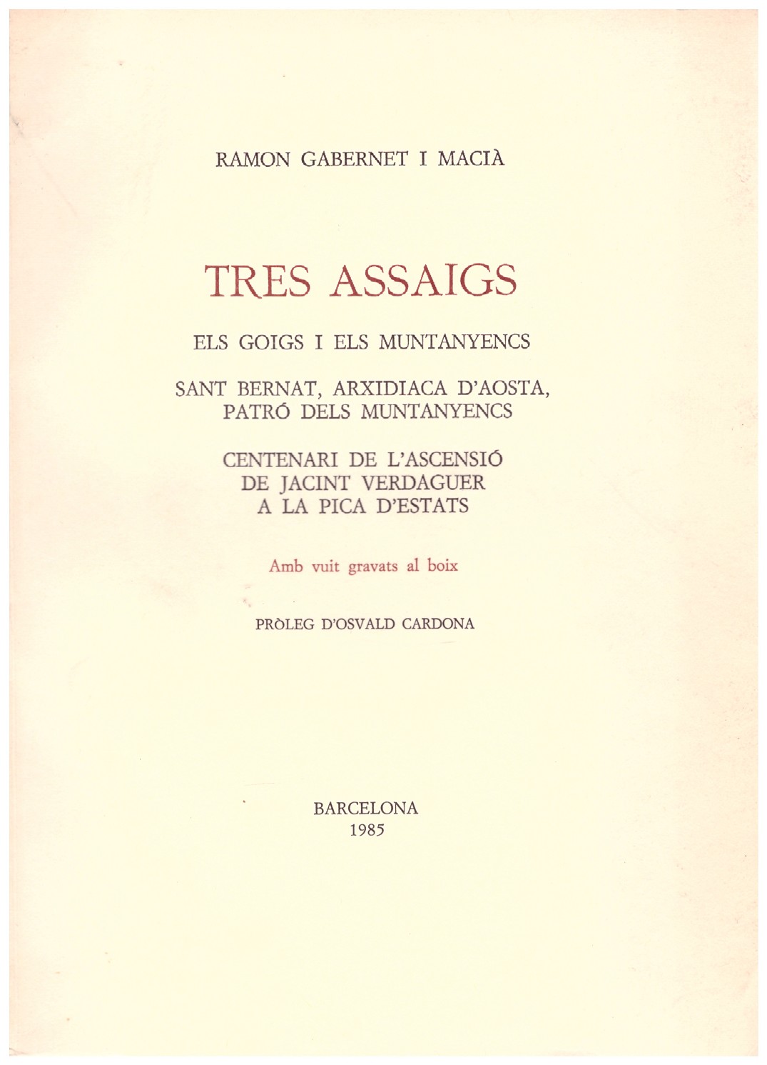 Amb vuit gravats al boix. Pròleg d'Osvald Cardona. Seixanta exemplars en paper de fil, especial per a aquesta edició, de l'obrador Morera, de Gelida, numerats a màquina: deu de 001 a 010, fora de comerçs, i cinquanta d'1 a 50. Exemplar nº 17. Firmado por el autor.