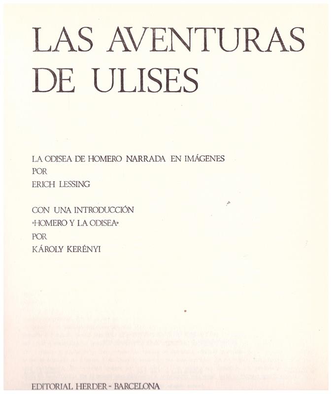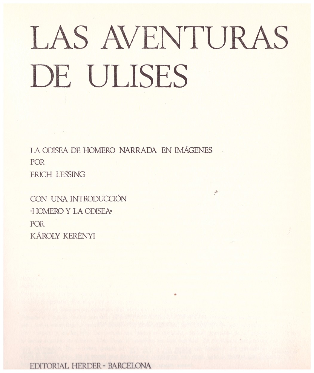 La Odisea de Homero narrada en imágenes por Erich Lessing. Con una introducción "Homero y la Odisea" por Károly Kerényi. La versión libre de los fragmentos citados se compulsó con el poema original. La introducción adaptada por Wolf Stadler y el argumento fueron traducidos al castellano por F. Fernández Turienzo. Cubierta algo deslucida. Profusamente ilustrado a color.