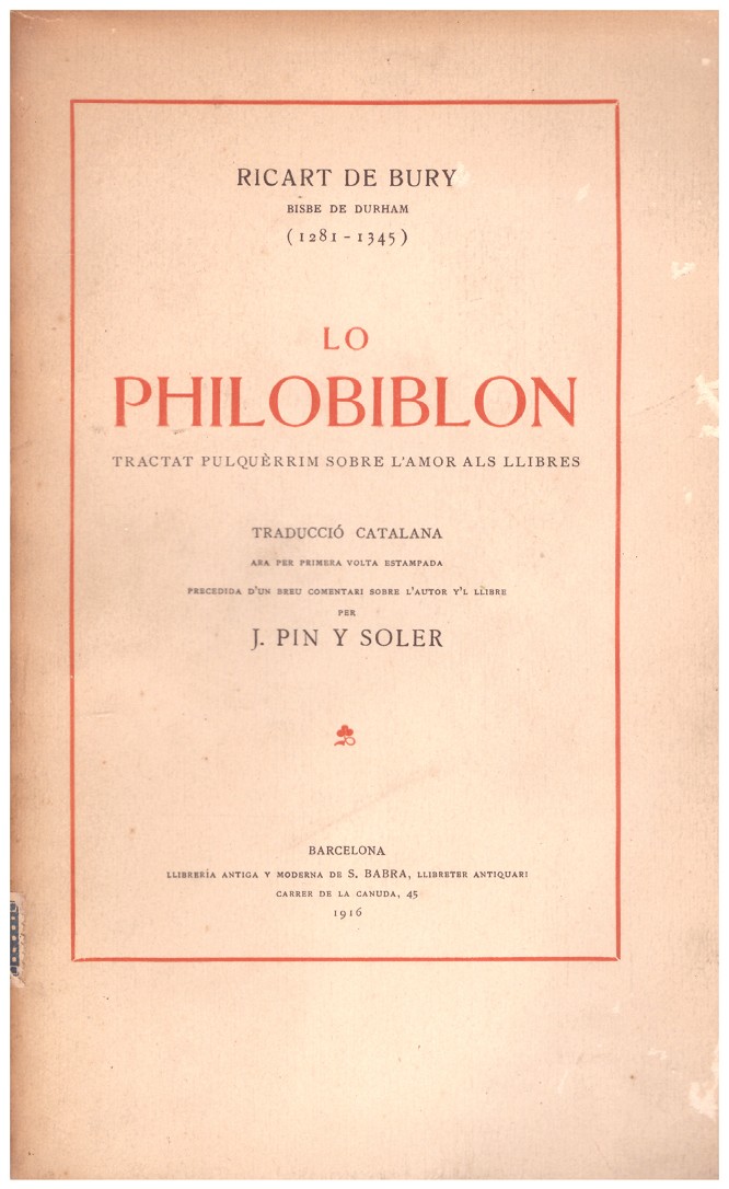 Ricart de Bury, Bisbe de Durham (1281-1345). LO PHILOBIBLION, Tractat pulquèrrim sobre l'amor als llibres. Traducció catalana, ara per primera volta estampada, precedida d'un breu comentari sobre l'autor y'l llibre per J. Pin y Soler. Barcelona, Llibrería Antiga y Moderna de S.Babra, Llibreter antiquari, 1916.