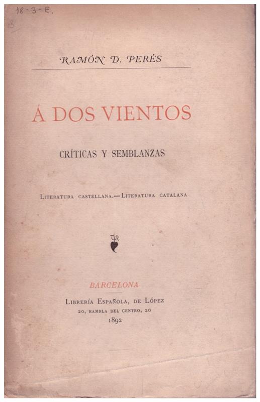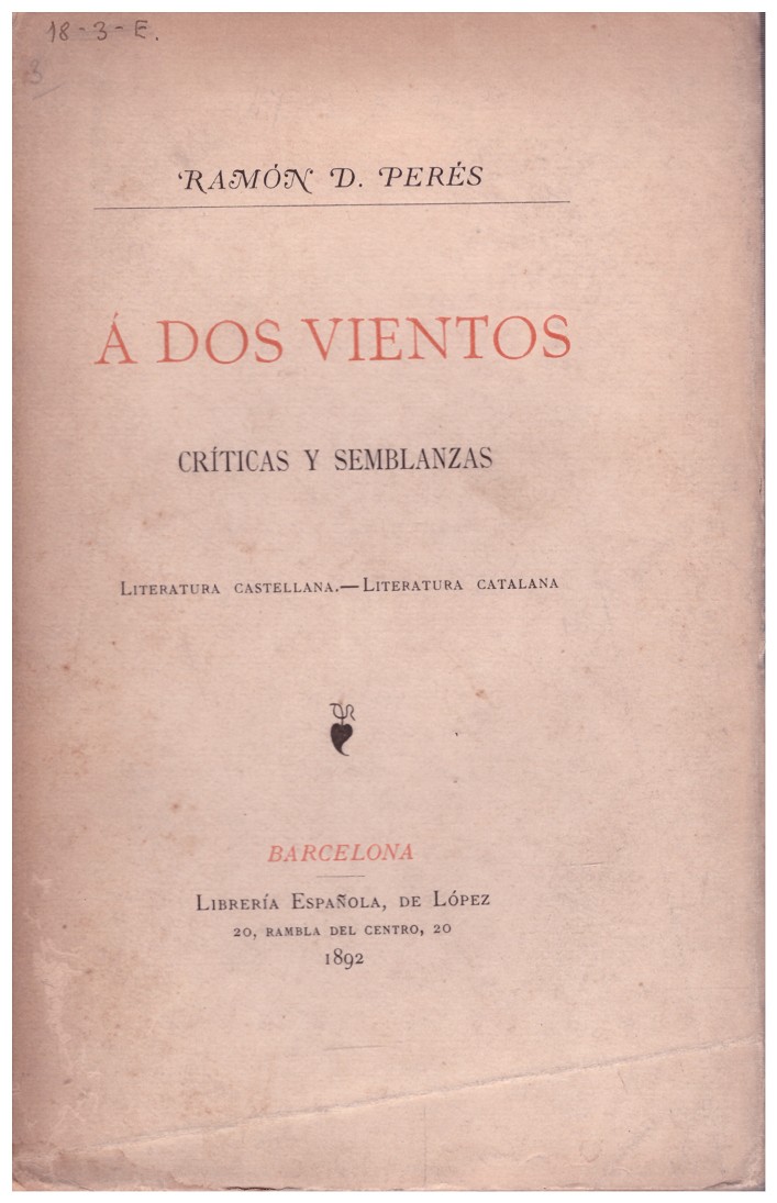 Á DOS VIENTOS. Críticas y Semblanzas. Perés, Ramón D. Literatura Castellana - Literatura Catalana. Barcelona, 1892. Librería Española, de López. Tip. y librería "L'Avenç" de Massó y Casas. Corte barbado, puntos de óxido. Lomo estriado y rozado en los cantos. Dedicado por el autor.