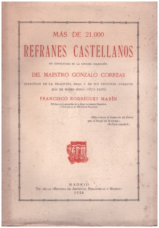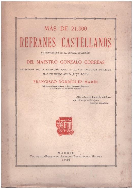 Mas de 21.000 refranes no contenidos en la copiosa coleccion del maestro Gonzalo Correas, allegolos de la tradicion oral y de sus lecturas durante mas de medio siglo (1871 - 1926)Hojas intonso, puntos de oxido
