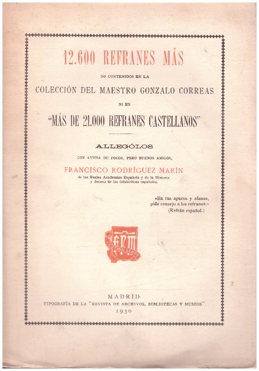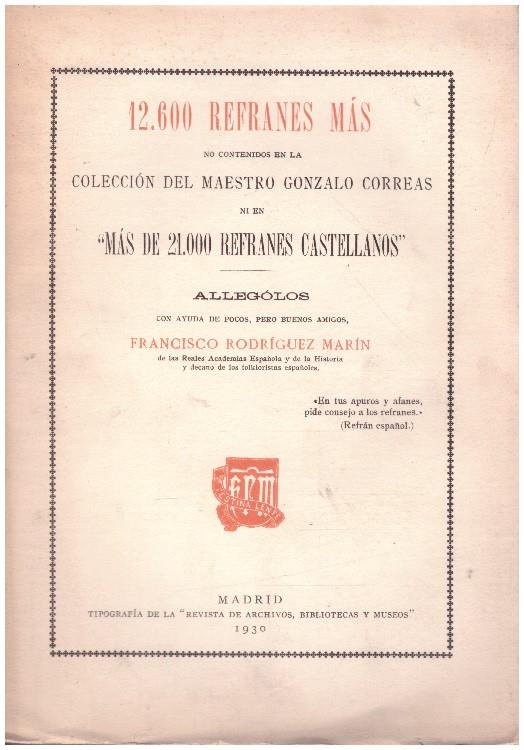 12.600 refranes mas no contenidos en la coleccion de l maestro Gonzalo Correas ni en Mas de 21.000 refranes castellanos, hojas intonso y amrillas