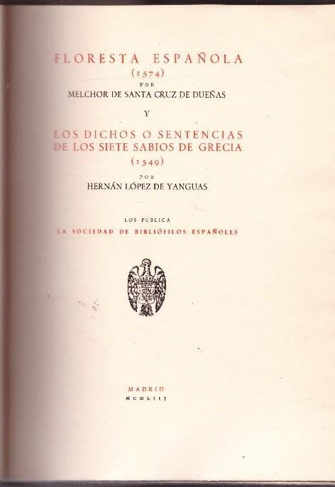 Edición publicada por La Sociedad de Bibliófilos Españoles en Madrid el año 1953 de "Floresta Española" de 1574 por Melchor de Santa Cruz de Dueñas, y "Los Dichos o sentencias de los siete sabios de Grecia" de 1549 por Hernán López de Yanguas. La edición incluye las dos obras, un prologo de R. Benítez Claros, una bibliografia, y las portadas originales de las dos obras. El corte exterior de las paginas és barbado.