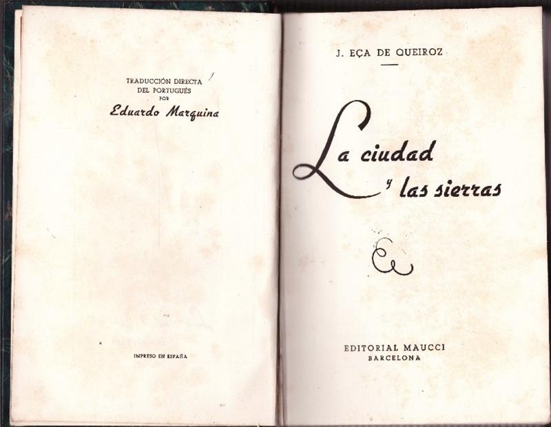 Edición de 1947 por Editorial Maucci de "La Ciudad y las Sierras" con tapa dura sin sobrecubierta. Sin ilustraciones y con una traducción directa del portugués por Eduardo Marguina. Se conserva en un buen estado, pero con algunas manchas de oxido.