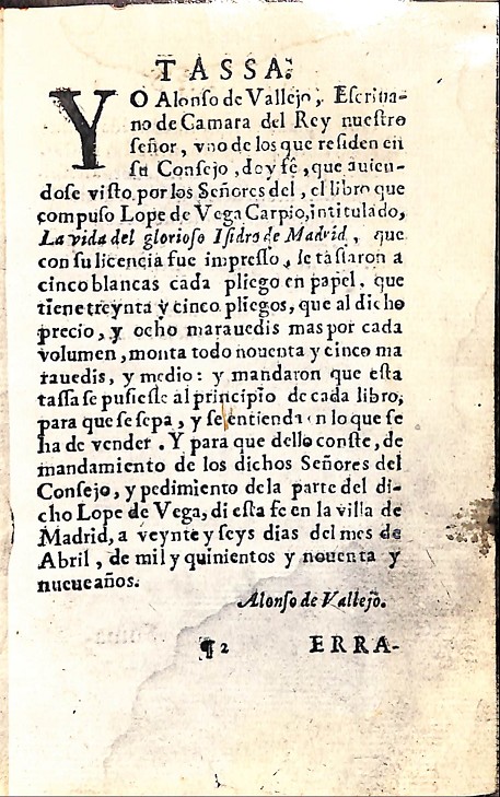 • PLANCHA: TASSA Y ERRATA POR ALONFO DE VALLEJO SOBRE EL LIBRO DE LOPE DE VEGA