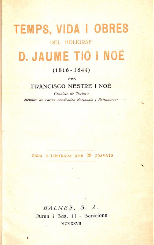 Ed. Balmes. Barcelona, Impremta Querol. Tortosa. Obra Il·lustr. con 28 facsímils y fotografias de Tortosa, en el texto. Re.encuadernado. Jaume Tió i Noé, dramaturg, poeta i periodista tortosí, va ser un dels membres del romanticisme a Catalunya. Malgrat no escriure en català, va recuperar a través de les seves obres teatrals moments de la història de Catalunya.