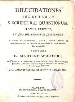 Interesante volumen teológico en latín que forma parte de una serie de tratados sobre cuestiones selectas de las Sagradas Escrituras. Este tercer tomo abarca los libros de los Paralipómenos, Judit, Ester y los Macabeos, con referencias también a los Evangelios y a la armonía bíblica.
