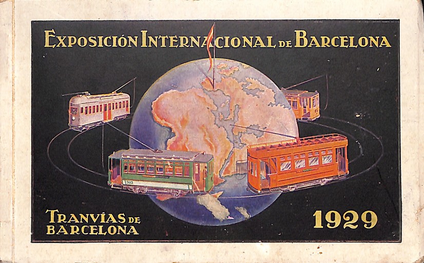 Colección completa de 12 postales ilustradas publicadas con motivo de la Exposición Internacional de Barcelona en 1929, dedicadas a los Tranvías de Barcelona. Cada postal muestra vehículos históricos de la red tranviaria de la ciudad, acompañados de mensajes de seguridad o diseño institucional. Edición de carácter promocional, con estética Art Déco. En la portada aparece una representación del globo terráqueo con tranvías orbitando como símbolo de modernidad y conexión internacional.