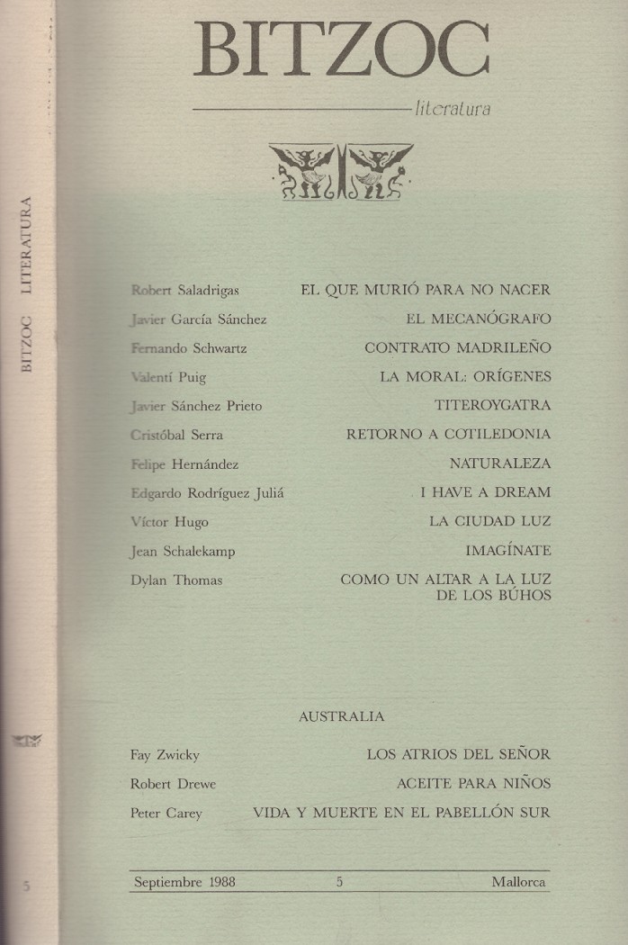 Revista trimestral, nº 5 (septiembre 1988). Palma de Mallorca. 167 pp. Recoge relatos cortos de Robert Saladrigas, Javier García Sánchez, Fernando Schwartz, Valentí Puig, Javier Sánchez Prieto, Cristóbal Serra, entre otros.